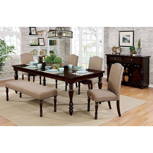 HOLCROFT Antique Cherry/Beige Bench, 56"W X 16"D X 18 1/2"H, 35.2lbs. Bring some classy inspiration into your dining room with this warmed toned wood bench featuring stylish turned legs. Seat is beautifully wrapped with linen-like upholstery, making it the perfect addition to any comfortable dining area. Features: Cottage Style" Nailhead Trim Turned Legs Padded Fabric Seat Solid Wood, Wood Veneer, Others Antique Cherry Finish