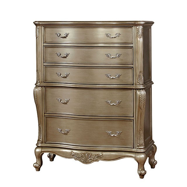 You may not have been born royalty but, with this gorgeous bedroom set, you'll be falling asleep in the lap of luxury every night! Boasting beautifully carved wooden details, the chest complements the fanciful bed with coordinating decorative accents and antique-inspired hardware drawer pulls.